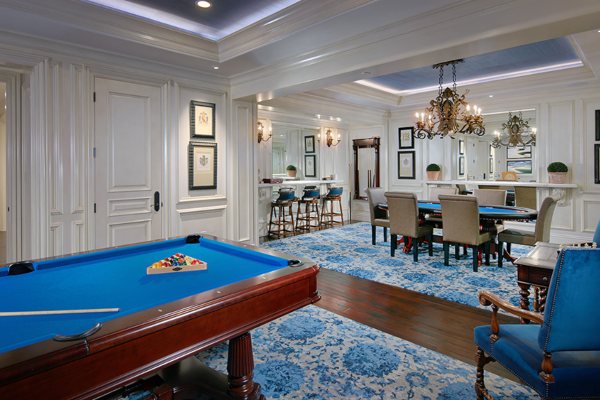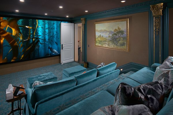 Дури и претходните сопственици не штедеа на придобивките. Како прво, вилата има домашно кино, во кое има удобни сини софи и sидови со шарени детали. Вилата има и сала за состаноци со објекти за телеконференција, како и простор за забава со бар.