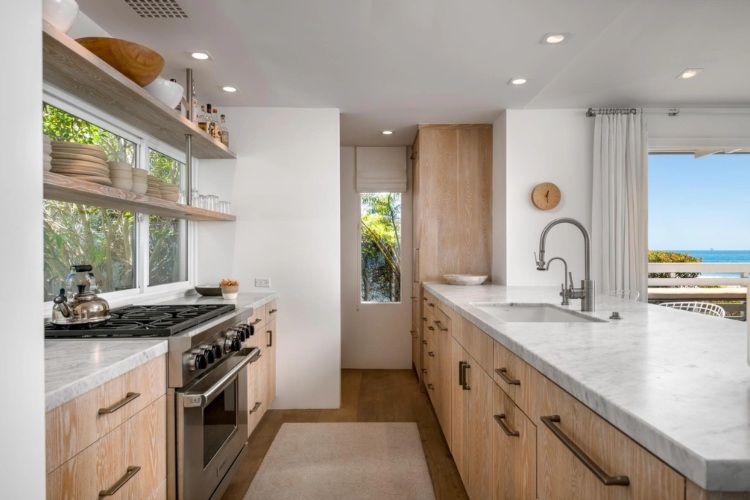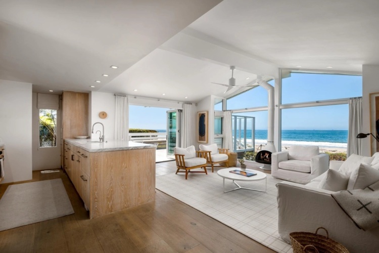 Има и кујна со гранитни површини и висококвалитетни апарати од не’рѓосувачки челик, дневна соба и трпезарија со камин што гледа кон океанот преку стаклени ѕидови.