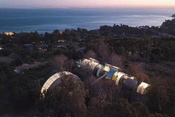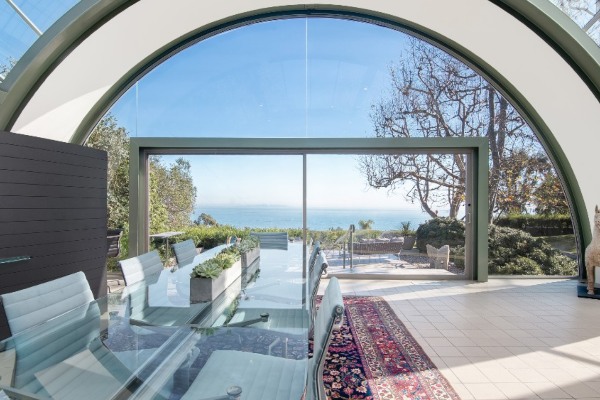Заглавена во планините на Санта Моника, во близина на брегот на Пацификот, оваа вила има неверојатен поглед на океанот од својата полукружна дневна соба. Благодарение на изобилството на стаклени елементи, исполнет е со природна светлина и изгледа уште попростран, додека во овој дел од него има и кујна, со гаража на едно ниво под земја.