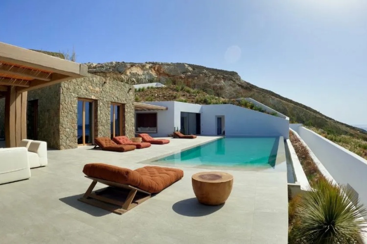 Низ бројните прозорци од подот до таванот, камената вила дозволува медитеранската светлина и кикладскиот пејзаж да „влезат“ во нејзините ентериери.