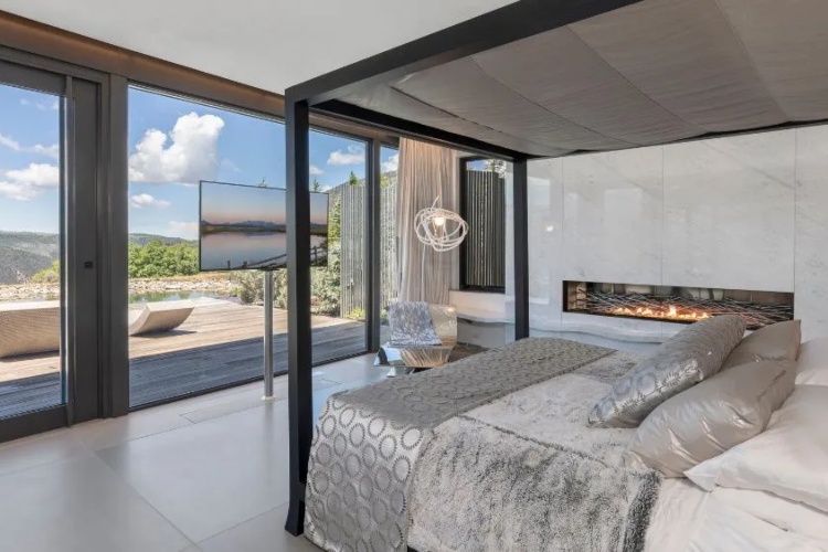 Резиденцијата со таа цена е обврзана да има неколку луксузни карактеристики, а во овој случај, добивате сопствена винарска „визба“, скулптури од кристали Сваровски, целиот мебел и вградена трамболина за скокање со поглед на неверојатни планини. И да, има езеро во кое можете да пливате во целосна приватност во вашиот двор.