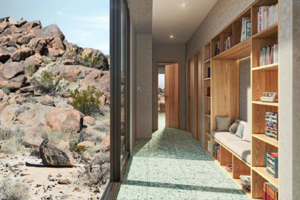 Внатре во куќата има две прекрасни спални соби, две и пол бањи, библиотека и катче за уживање во читањето, а вкупниот простор е 164 квадратни метри. Строгата бетонска надворешност на оваа зграда одржува пријатна температура во внатрешноста, додека прозорците од подот до таванот нудат непречен поглед на пустината, што ќе ви донесе бројни допаѓања на Инстаграм. Стаклените елементи го прават ова живеалиште да дејствува како дел од домот што има своја личност, со додавање врати и елементи од даб, теразо плочки и други акценти. И покрај фактот дека се наоѓа во срцето на пустината, овој дом е исполнет со удобности на модернизмот, апарати на JennAir, електрични ролетни и вградена библиотека.