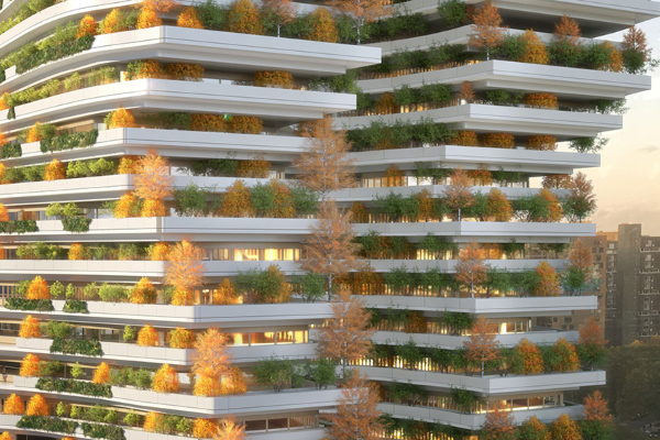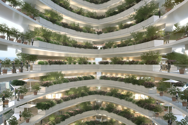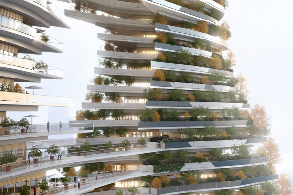 Футуристичкиот дизајн вклучува дрвени градежни материјали, заедно со 8.300 грмушки, 1.600 дрвја и 8.300 квадратни метри ѕидови од растенија. Овие органски супстанции не само што ќе бидат визуелна изјава, туку исто така ќе апсорбираат штетни емисии. Покрај тоа, структурата е опремена со 2.300 квадратни метри соларни панели и 36 ветерници, со цел да се произведе чиста енергија.