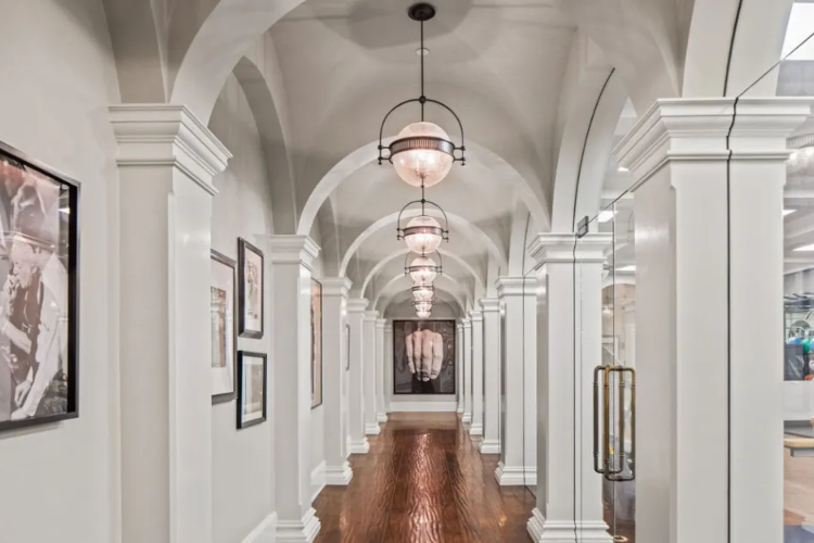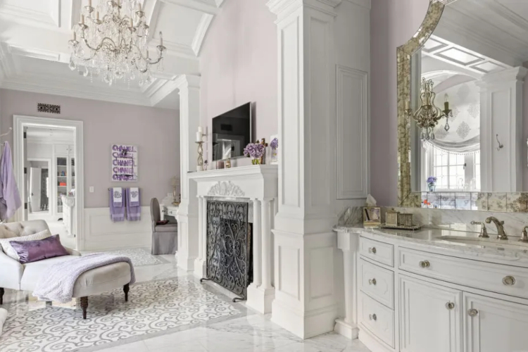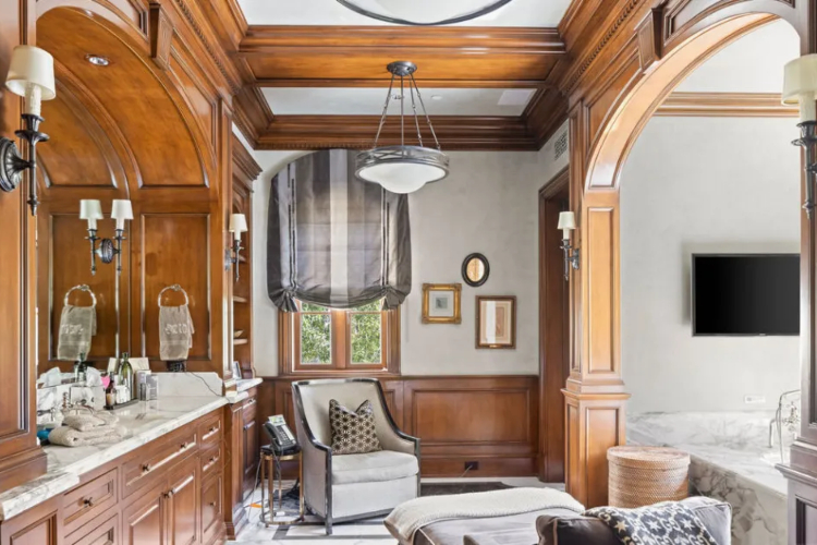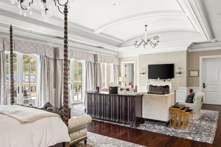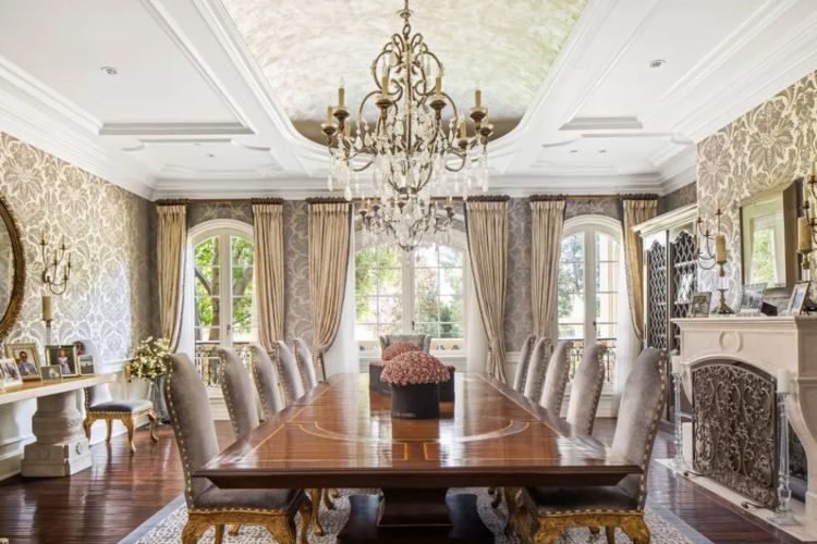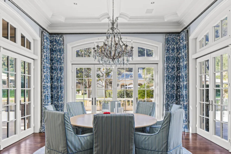 Сончевата сала за појадок има поглед на имотот, додека специјалната празнична трпезарија е украсена со шарени тапети, кристален лустер и има уште еден камин. Горе, главната спална соба има темно кафеави дрвени подови, простор за седење и приватен балкон, како и двојни бањи и плакари.