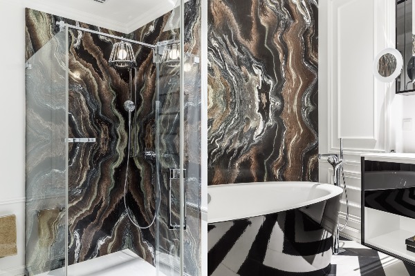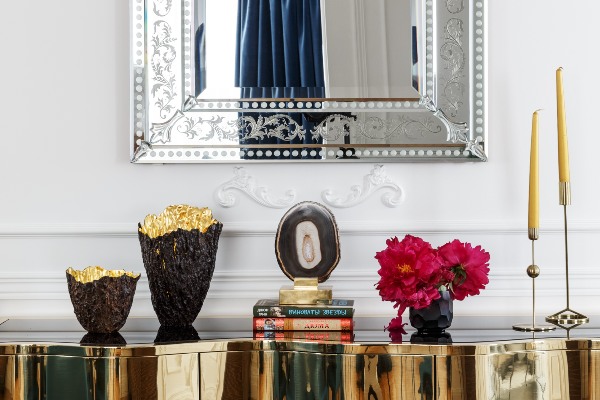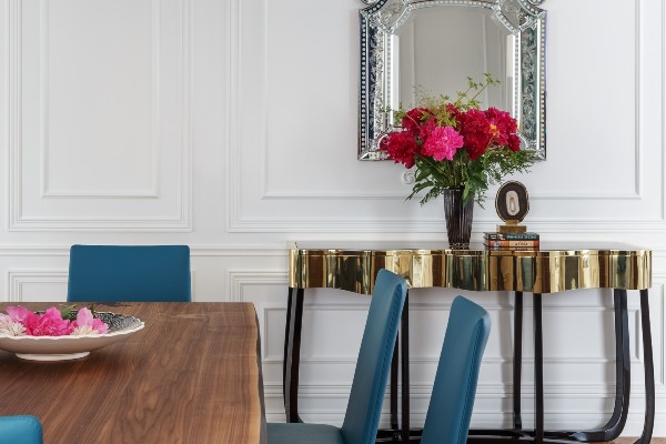 Покрај дневната соба е подеднакво еклектична трпезарија, која е совршен спој на живописен модерен мебел од најпознатите иконски брендови, како што се столчињата Bonaldo и масата Cattelan Italia. Софистицираниот и аристократски стил на овој простор е создаден благодарение на современото уметничко дело, кадифените завеси и уникатниот лустер од „Delightful Lighting Brand“ кој виси над трпезариската маса.
