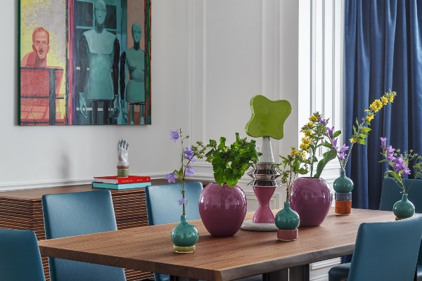 Овој сјаен и радосен дизајн на ентериер покажува како изненадувачка шема на бои, стилски парчиња мебел и импресивни современи уметнички дела можат да се спојат и да ја оживеат убавата куќа.