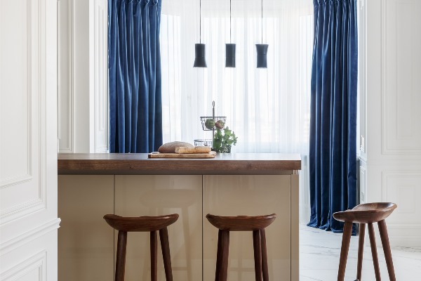 Кујната е понеутрална во бои со прави линии, светли и темни неутрални тонови и дрвени акценти. Претставува нешто како тишината помеѓу бурата од бои на други области. Живописни жолти столици и сини завеси се одличен акцент на оваа кујна, што рефлектира како еколошките мотиви и луксузните допири можат совршено да се вклопат.