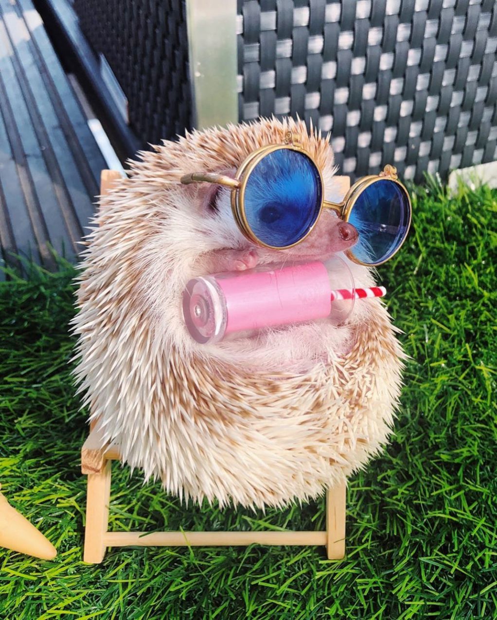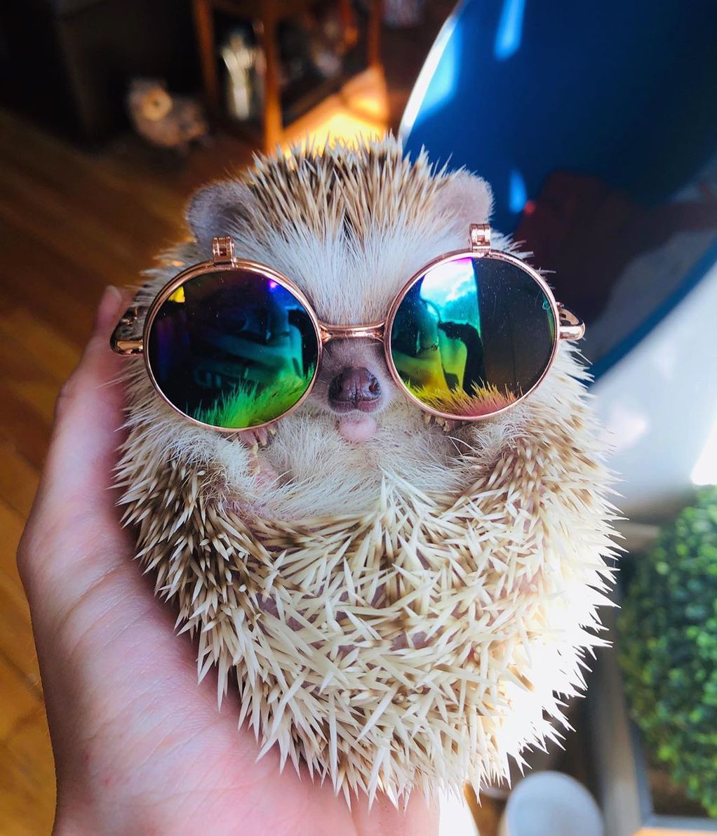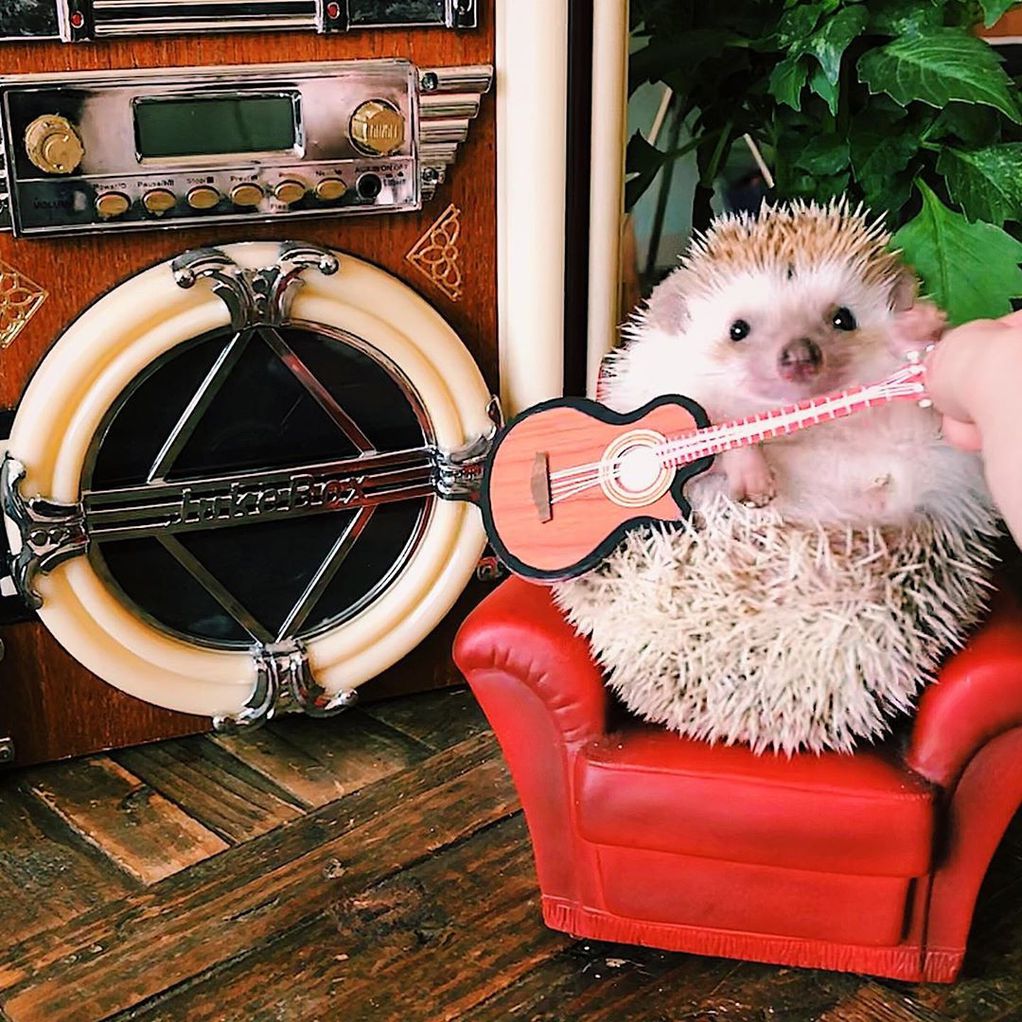 Малиот еж знае да се забавува, па може да се види како Дарвин седи во фотелја облечен како рок sвезда додека држи гитара. На втората фотографија тој изгледа тотално кул со ретро очила за сонце, а неговите следбеници на Инстаграм беа воодушевени од фотографијата на која тој седи на минијатурен душек на надувување во форма на крофна и ужива во базенот.