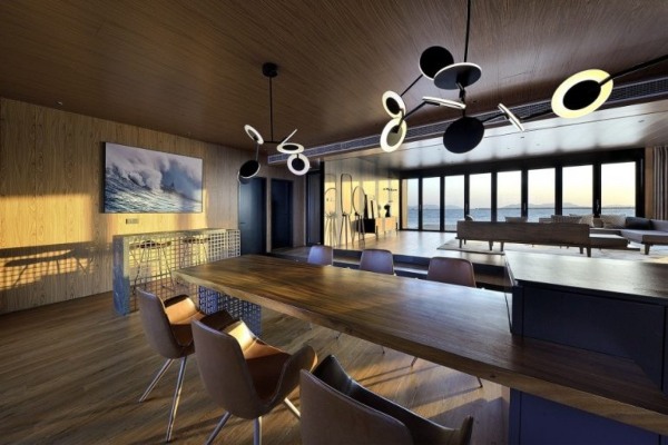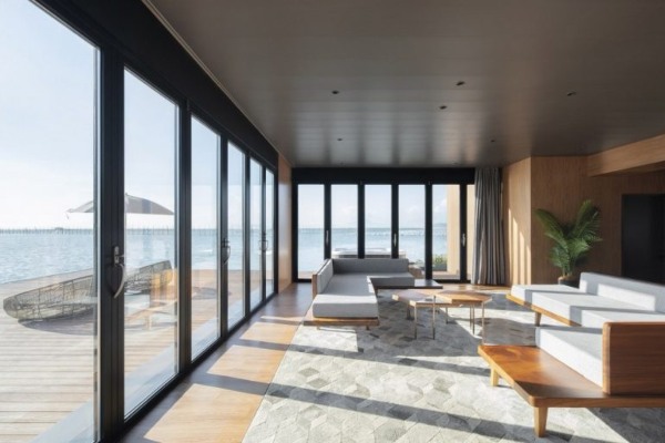 Структурата на куќата има лизгачка стаклена врата лоцирана во сите правци, задолжена за обезбедување прекрасен панорамски поглед на водата што ја опкружува. Кога влегувате во внатрешноста, можно е да се забележи дневната соба со дарежлива квадратура, која вклучува трпезарија и кујна. Куќата обезбедува пристап до голема тераса од секој дел од нејзиниот ентериер, и овој простор доаѓа како совршено место за риболов, обука или каква било друга активност покрај морето.