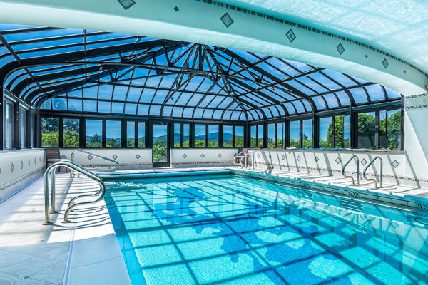 Што се однесува до сите овие спортски активности, тие започнуваат со затворен базен кој се наоѓа во главната куќа. Доаѓа со украсен стаклен покрив со метална рамка што може да се повлече во летните денови. За време на неодамнешното реновирање, подот на базенот е украсен со керамички плочки на дното покажувајќи ги контурите на езерото Мус.