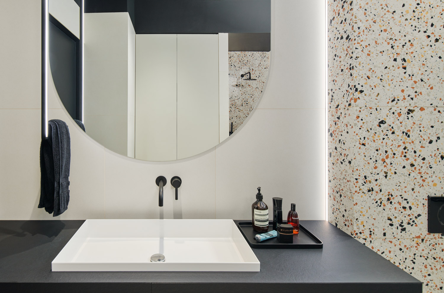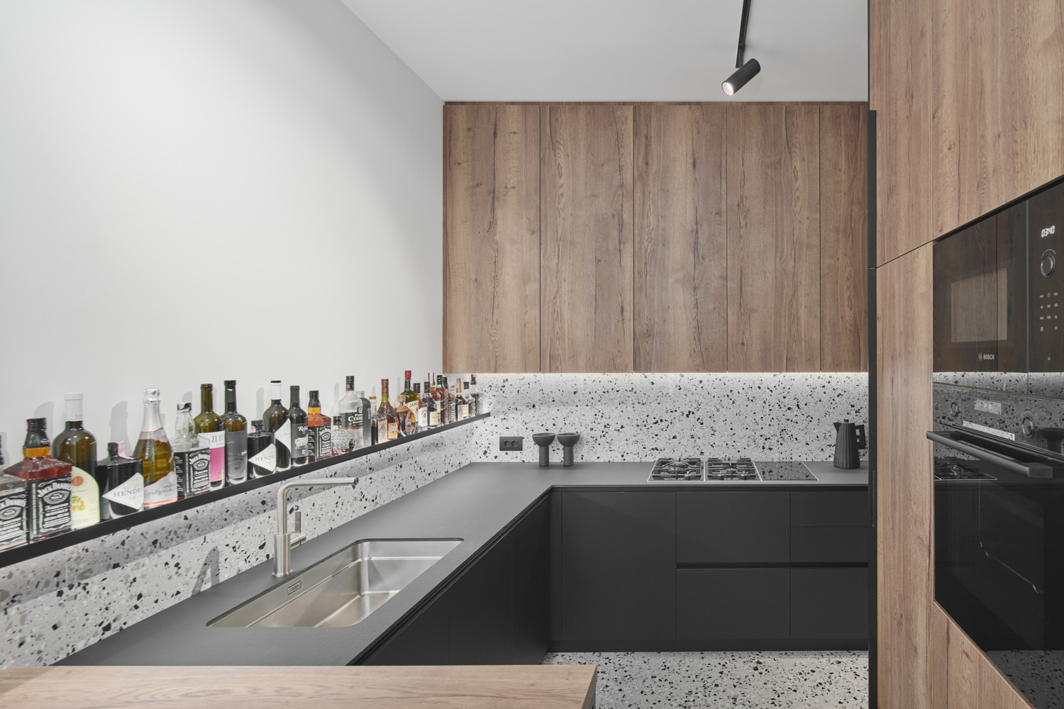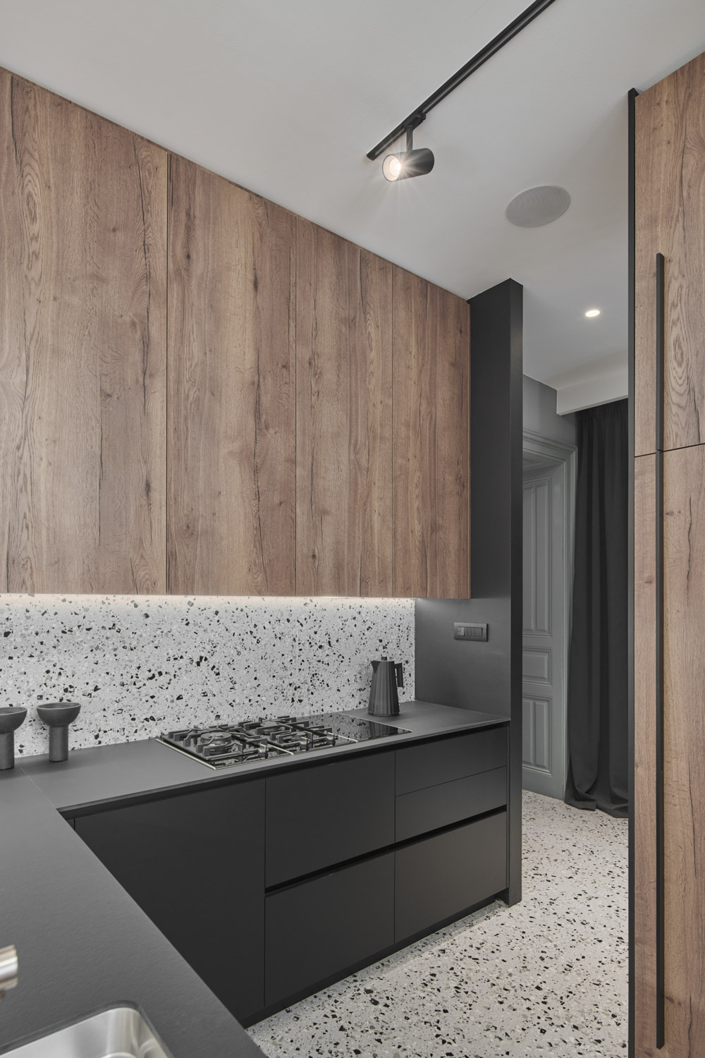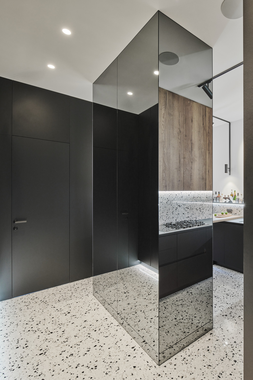 Кујната е одделена од влезната област со вертикален елемент обложен со грегио огледало околу кое се создава кружна врска. Бидејќи кујната често е центар на дружење, ние сакавме да го отвориме просторот и да дозволиме циркулација и слободен проток и движење низ станот.