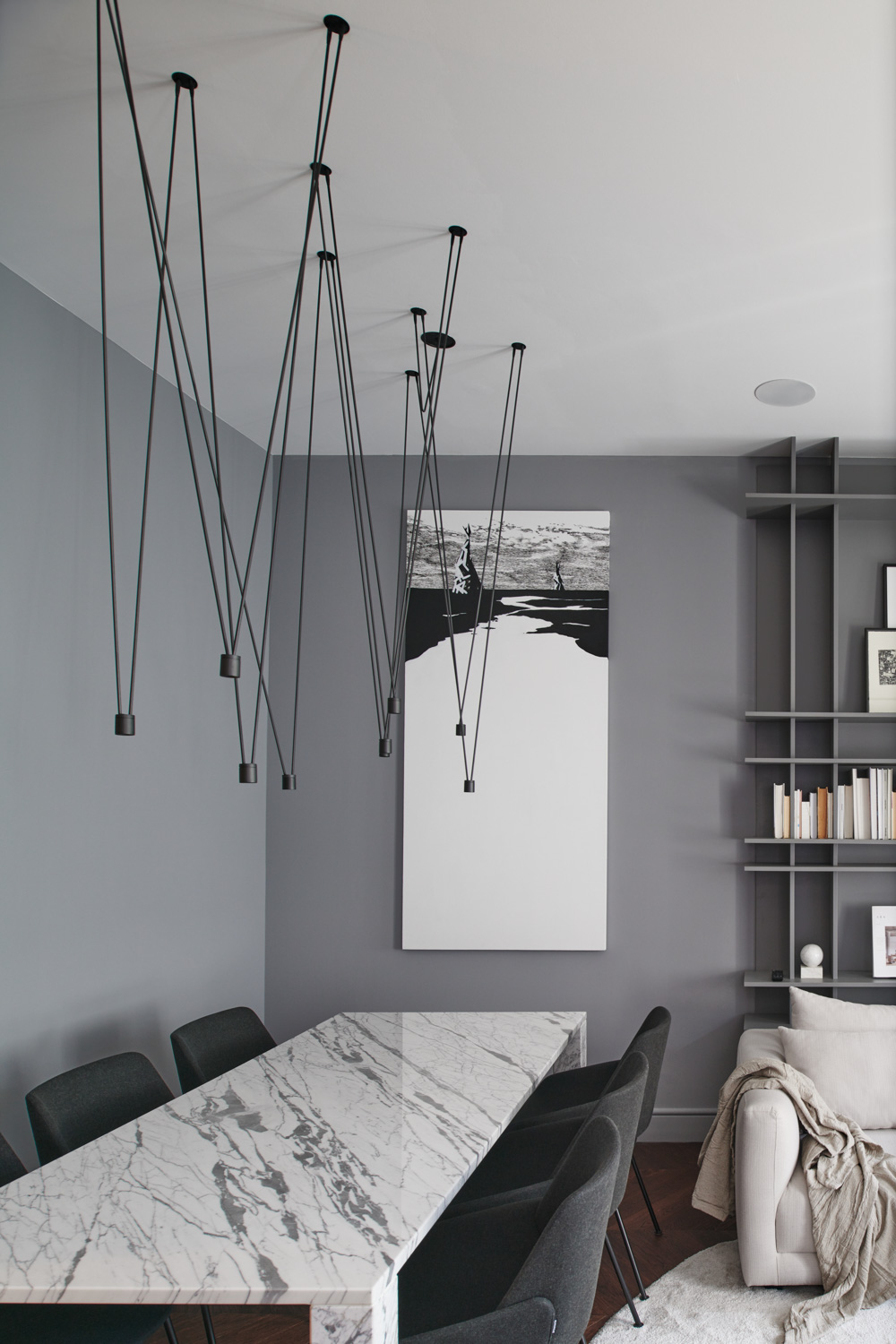 Осветлувањето е со минимален дизајн, внимателно избрано и пресметано за овој стан. Основата е изработена од рефлектори за црна шина кои се појавуваат како мотив во сите области на станот, покрај кои на некои места е инсталирано вдлабнато осветлување. Главното дизајнерско „парче“ осветлување е поставено над трпезариската маса, прекрасна светлосна инсталација Vibia Match специјално конфигурирана за позицијата каде што се наоѓа.