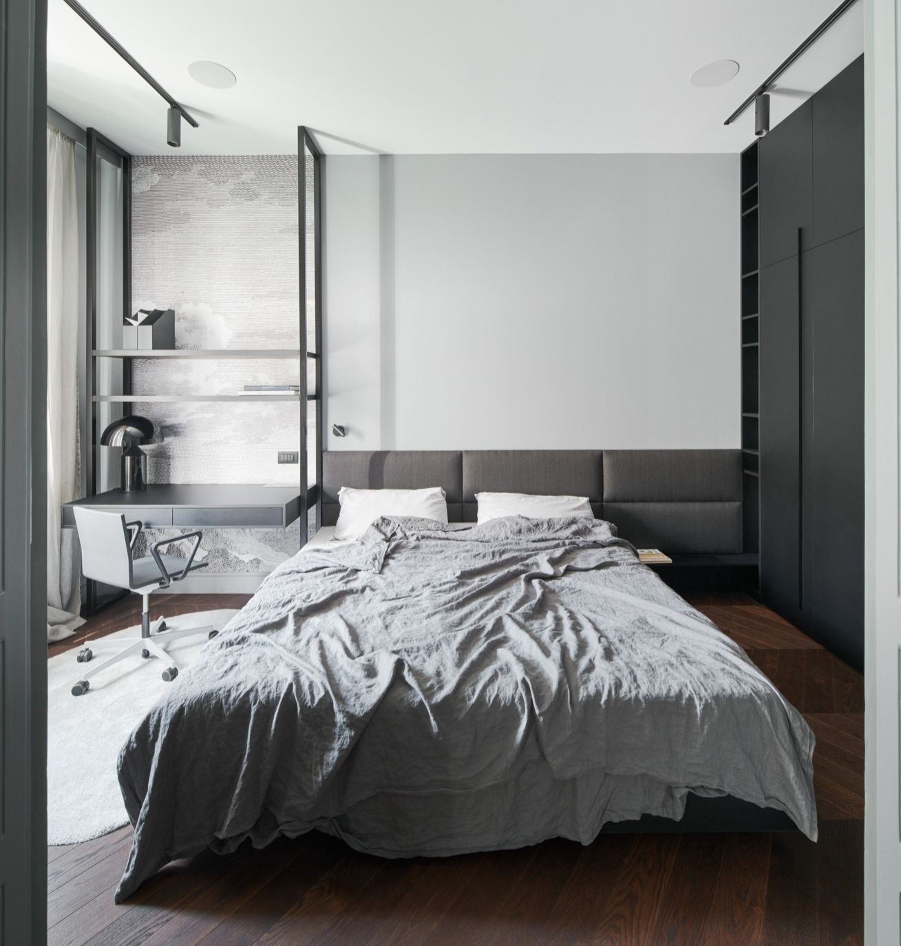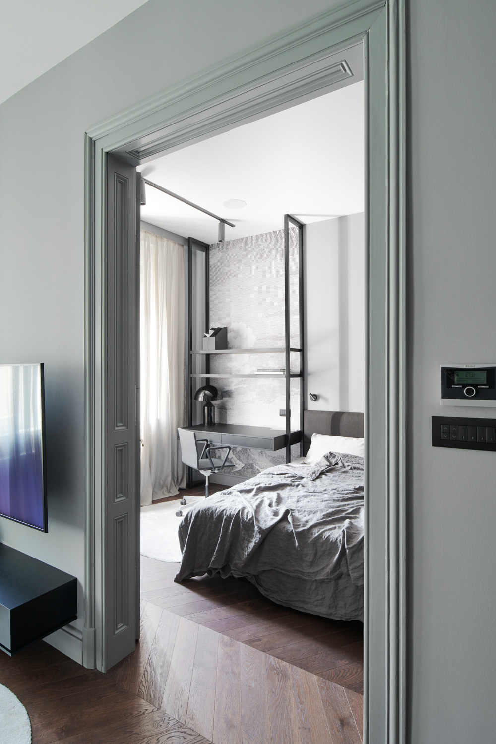Спалната соба е направена според хотел со висок стандард. Големиот кревет продолжува на ѕидната тапацирана глава. Веднаш до креветот има работна маса со специјално изработена позадина. За примерокот на тапет беше искористена копија од бакарна плоча од енциклопедија на природата од 18 век испечатена на ткаенина.