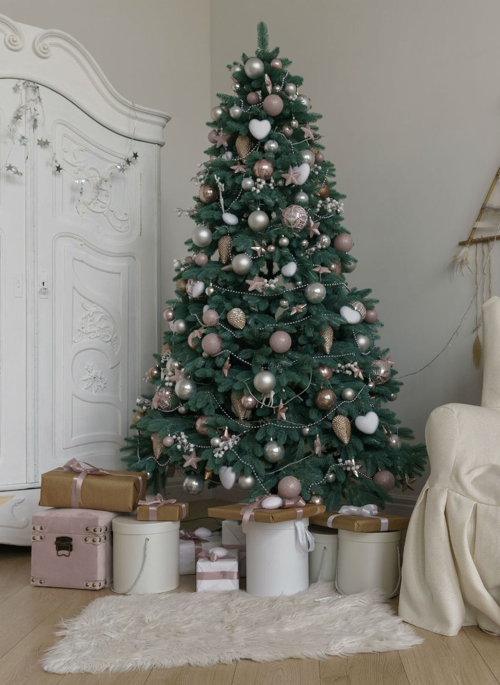 Овој стил на украсување се карактеризира со украси кои светкаат односно сјаат, како и оние со нежни розови тонови. Дрвото украсено на овој начин е многу софистицирано. Кога украсувате, користете орнаменти од различни форми, а за подароци користете украсна хартија во нежно розова боја, за сè да формира романтична целина.