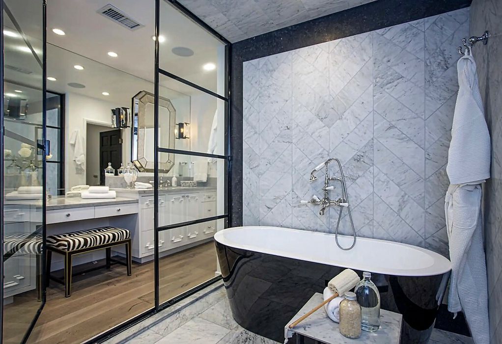 Украсен е до најситен детал, а внимание привлекува кујната со голем остров, како и луксузната бања со црна када, направена за уживање по напорниот ден.