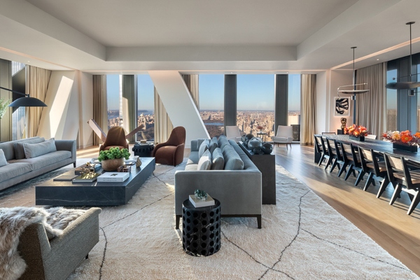 Директен, приватен лифт ќе ве однесе директно до влезот на овој стан кој се карактеризира со врата од костен, со рачки и брави направени по мерка. Ходникот се отвора кон прекрасната дневна соба и просторијата за прием, од каде прозорците од подот до таванот ви даваат спектакуларен поглед на Central Park и панорама на градот. Дневната соба со површина од 140 квадратни метри е закотвена со кадифени софи близнаци и сива мермерна масичка. Оваа просторија, но и сите други, се исполнети со уметнички дела, што е сосема очекувано со оглед на локацијата на станот. Блиската трпезарија содржи пар лустери со плови над преголемата маса, која е нагласена со црни столици.