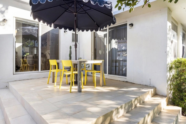 Кујната излегува на тераса за трпезарија на отворено двор со трева. Има и мастер бања со када, двојни мијалници и туш.