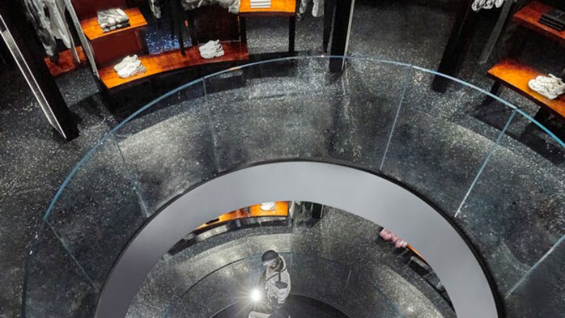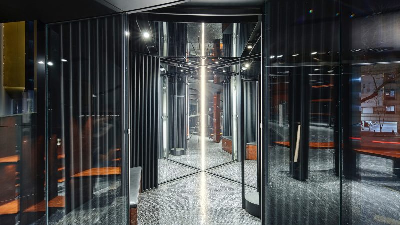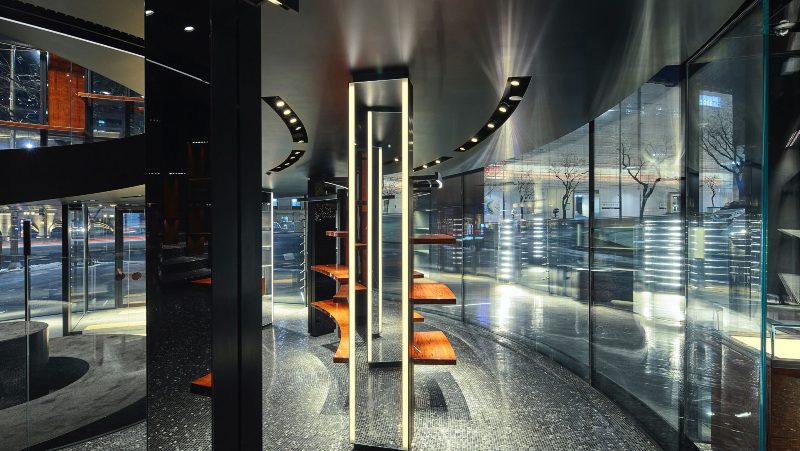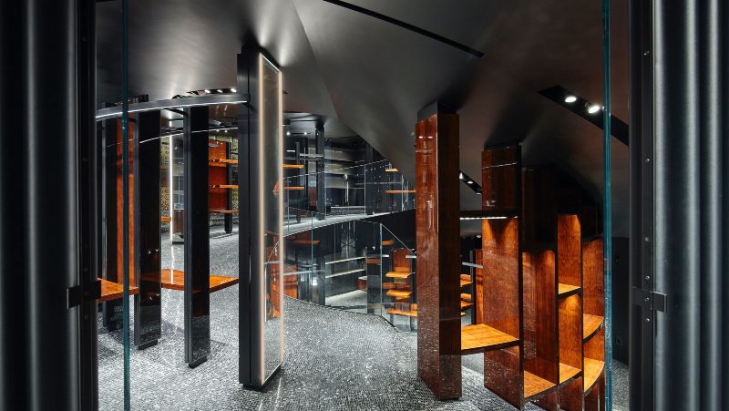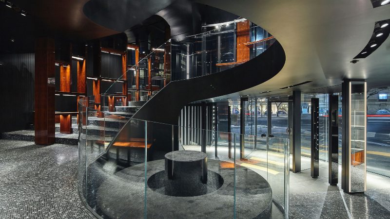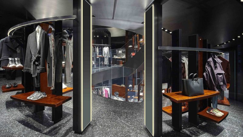 Внатрешноста на бутикот е конструирана околу широко спирално скалило обложено со мермер Nero Marquina. Беспрекорно поврзува различни нивоа, поканувајќи ги посетителите да ги истражат колекциите Dolce & Gabbana. Во ентериерот доминира црната боја во безброј нијанси и завршетоци. Сјајно црно стакло, сив бетон и црн алуминиум во интеракција со топли и софистицирани нијанси на дрво од манго создаваат пријатна и софистицирана атмосфера. За да ги претстават колекциите, дизајнерите користеа модуларни елементи на кои беа закачени полици и прачки на различни височини.
