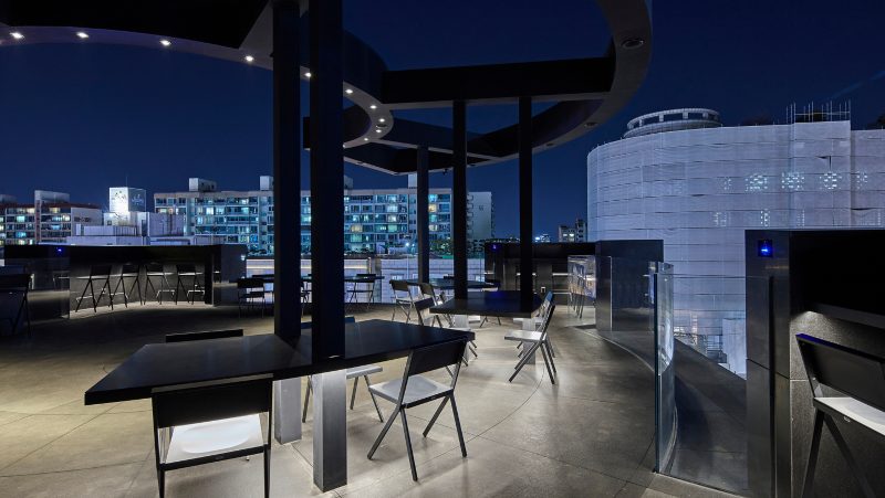 На покривот има отворена тераса, а на самиот врв има голема полукружна надстрешница, што е еден вид продолжение на спиралното скалило. Тука, посетителите ги пречекува заоблена гранитна шипка, елегантни црно-метални столици и вкусни коктели базирани на мартини.