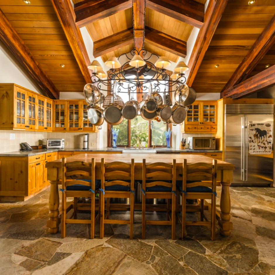 Изградена пред повеќе од три децении и интензивно реновирана од парот за време на нивното време таму, во архитектонската структура доминираат дрво и стакло. Големината на собите е нагласена со отворени камини, високи тавани прегрнати со дрвени греди и големи стаклени ѕидови и прозорци со поглед кон океанот.