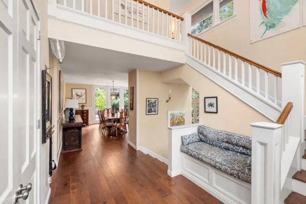Статусот на куќата се рефлектира во самиот голем влез кој и покрај луксузот ја поддржува традиционалната американска естетика. Забележителни карактеристики вклучуваат пространи дрвени скали и скриена клупа што служи како агол за читање – или место за одмор откако ќе влезете низ влезната врата.