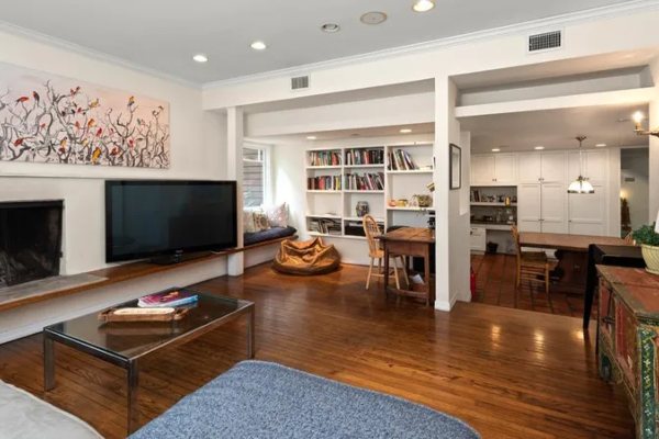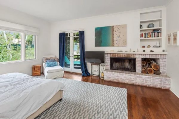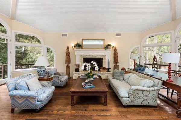 Покрај трпезаријата, домот на Арнолд Шварценегер нуди удобен простор за живеење. Просторот е слично осветлен со природна дневна светлина што ја омекнува сината и жолтата шема на бои. Украсениот камин стои како фокусна точка на собата и ја нагласува атмосферата на удобност во собата.