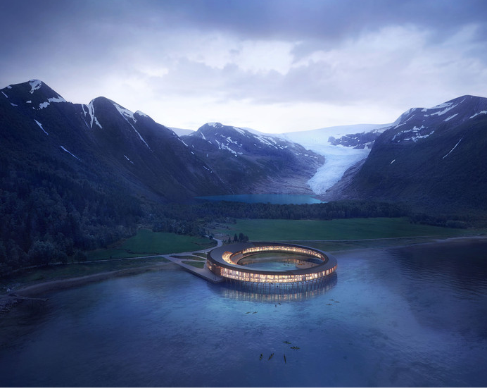 Архитектурата е инспирирана од локалните традиции за градење крајбрежје и стои на дрвени купови, растворувајќи ја границата помеѓу земјата и фјордот. Обликот на хотелот обезбедува панорамски поглед на фјордот и искуство за живеење во близина на природата.
