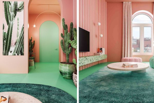 „Сакав да создадам место каде што можете да го заборавите вашиот стресен работен ден и да имате можност да го оставите зад себе градскиот метеж во светла, нежна и донекаде зачудувачка куќа …“ Со оваа реченица, младиот руски архитект Дмитриј Реутов го опишува својот дизајн на мал стан на Менхетен во шеќерна розова и зелена нане боја , украсен со големи кактуси.