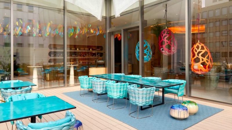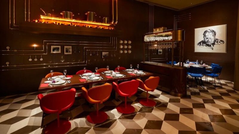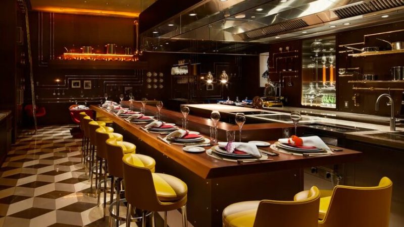 Централниот елемент во ентериерот на ресторанот е отворена кујна, украсена со топло дрво, што е иконски мотив за просторите на Louis Vuitton. Мебелот за новите објекти е создаден од Токујин Јошиока, кој претходно соработувал со француската куќа.