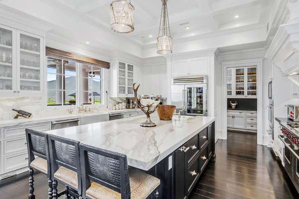 За жал, кога станува збор за ентериерот, фотографиите што се на располагање се доста оскудни и ни го покажуваат само влезниот простор и кујната со мермерни детали, врвен кујнски остров и професионални апарати.