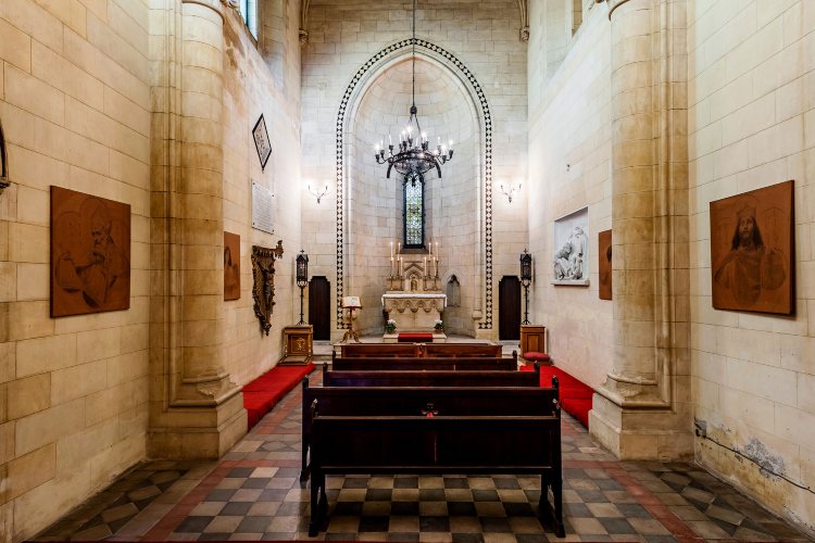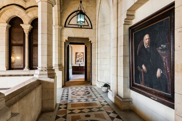 Импресивниот замок се карактеризира со неверојатни мермерни скалила, високи тавани и камени заоблени столбови. Арките придонесуваат за чудната атмосфера на овој уникатен имот, додека геометриските обрасци во златна и сина боја се граничат со таваните, а византиските украси и слики ги исполнуваат ентериерите.