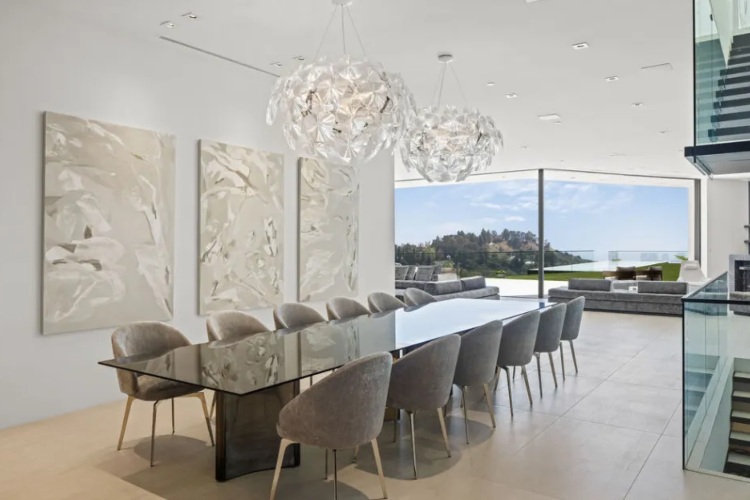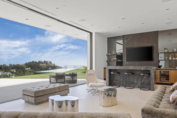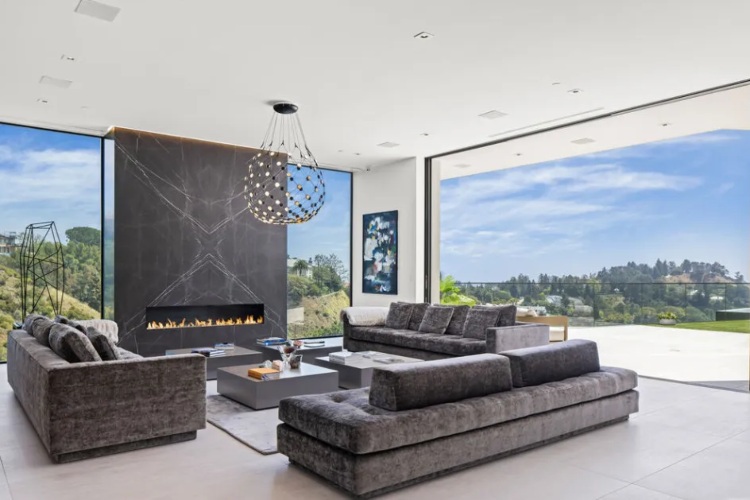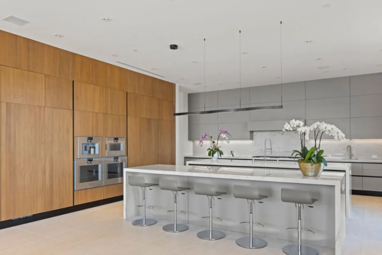 Огромната кујна нуди два острова со кварцит, а има и мермерни камини според книгата, винарска визба и кино со седишта.