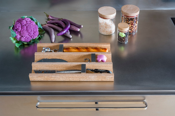 Кујната во Abimis е исто така надополнета со A_ccessori, линија на модуларни, мултифункционални предмети – изработени од челик, буково дрво и боросиликатно стакло – создадени за да понудат дополнителни алатки за оние кои сакаат да готват дома како професионален готвач.
