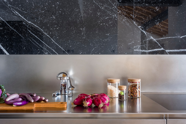 Кујната е целосно конструирана од не’рѓосувачки челик, биолошки неутрален метал кој не ослободува никакви материи на храна, е отпорен на корозија и е во состојба да издржи температура до 500 ° C и е 100% рециклирана – заедно со целосно сопствено производство, не само во однос на димензиите, но и во однос на побарувањата и движењата на клиентите, содржи уникатни детали, карактеристики и иновативна опрема, кои традиционално се користат во кујните за професионални ресторани.