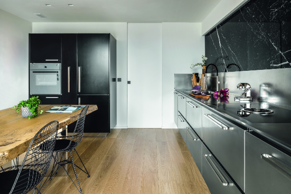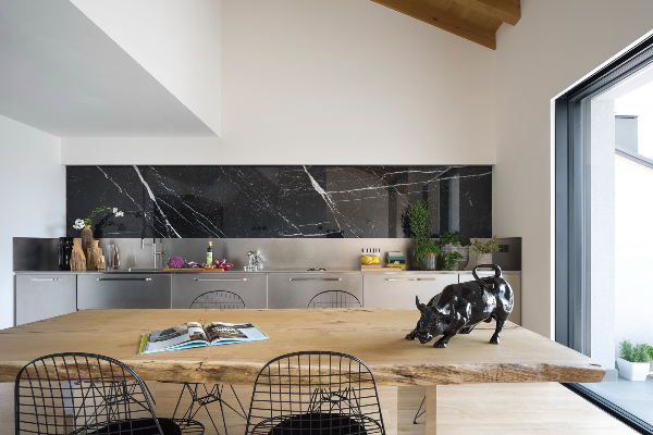 Пристапот на брендот Абимис заснован на сопствен дизајн, со сопствен дизајн на кујна и искуство со бренд во обработка на не’рѓосувачки челик, се открива во овој контекст не само во блокот и високите единици, кои се целосно дизајнирани да ги задоволат потребите на сопственикот, туку и при изградбата на голема трпезариска маса во индустриски стил: масичката од масивно дрво е всушност поддржана од два импресивни елементи од не’рѓосувачки челик. Совршен пример за тоа како два естетски спротивставени материјали можат да создадат високостепено влијание.
