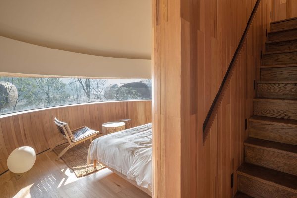 Куќата е изградена така што не го допира шумскиот под, минимизирајќи го влијанието на конструкцијата врз самата локација и овозможувајќи влез од надворешните скали. Внатре, има спална соба со закривени панорамски прозорци кои овозможуваат прекрасен поглед на природата, што ве поканува на интроспекциска сесија, додека седите покрај нив со омилениот топол пијалок во раце, чекајќи да се распрсне утринската магла.