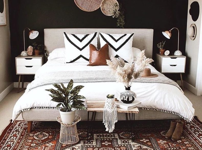 Прво треба да го изберете вистинскиот кревет. Проверете ги димензиите, а потоа изберете според личен вкус – метална рамка, многу модерно и меко тапацирано или топло дрво. Апсолутен тренд во декорацијата е контрастот на боите, така што со црна глава, тапетите со црно-бела апстрактна шема или дрвена кофражни работи одат добро, со топли бои на декор, поладни нијанси на sидови, итн.