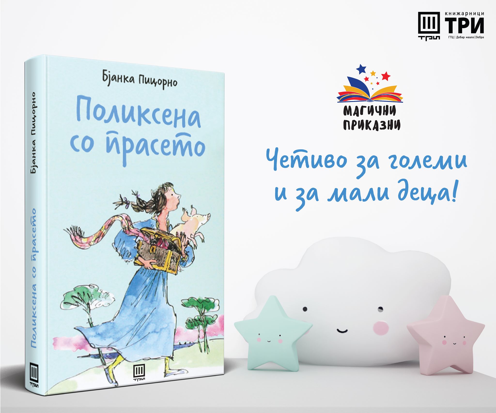 Издaвачки центар ТРИ ја објави книгата  „Поликсена со прасето“ од познатата италијанска писателка Бјанка Пицорно, во рамки на новата едиција „Магични приказни“ поддржана од програмата „Креативна Европа“ на Европската Унија.