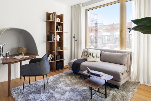 Бојата, исто така, одигра многу важна улога во текот на целиот процес, така што можеме да забележиме посветли нијанси во акценти на одредени места, додека одредени главни нијанси се спојуваат на значаен начин во одредени простории. Дневната соба има едно од најпознатите парчиња на француската марка, збрчкани комплети од поприродна, земјена сина боја, комбинирани со смела сина фотелја на истиот простор. Според Симон Вингерхоетс-Зисман, извршен директор на Ligne Roset Americas, природните и сините тонови се вистински контраст со бетонската џунгла, отворајќи го просторот и достигнувајќи кон ноќното небо.