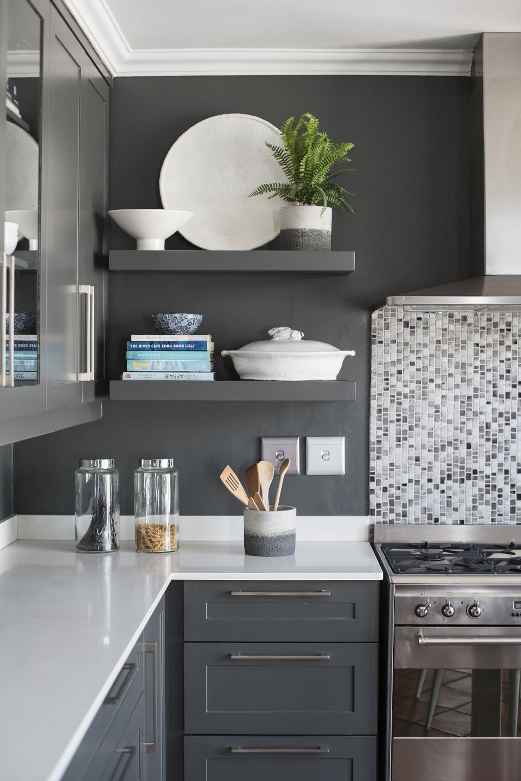 Ладните сиви бои изгледаат добро со нерѓосувачки челик, а акцентите во светли бои, како што се мали апарати, врати од кабинети и столици за шипки, ќе му дадат живост на просторот и ќе го направат интересно.