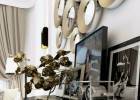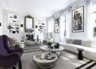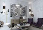 Главниот декор на оваа просторија е нагласен со месинган акцент, кои придонесуваат за конечен луксузен амбиент на собата. Подот е од природно дрво и кое емитува топлина, без да се меша секако со елеганцијата која моѓе да се забележи тука.Просторот во дневната соба се шири покрај додатокот за седење во кој црно-белата тема е надополнета со темно виолетова нијанса.