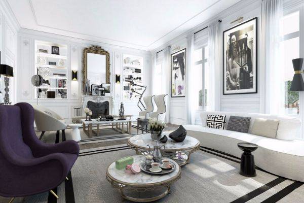Главниот декор на оваа просторија е нагласен со месинган акцент, кои придонесуваат за конечен луксузен амбиент на собата. Подот е од природно дрво и кое емитува топлина, без да се меша секако со елеганцијата која моѓе да се забележи тука.Просторот во дневната соба се шири покрај додатокот за седење во кој црно-белата тема е надополнета со темно виолетова нијанса.