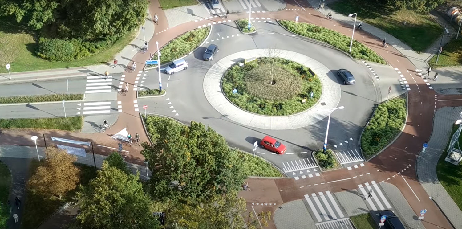 Велосипедистите на вакви кружни текови имаат свој надворешен прстен обоен со контрасна кафено-црвена боја, со велосипедски премини преку секој од четирите пристапни патишта. Тука се и пешачките премини преку зебра за секој пристапен пат. Возачите мораат да им отстапат место на пешаците и велосипедистите кога влегуваат и излегуваат од кружниот тек. Ширините на сообраќајните ленти на обиколницата исто така се намалени, а влезните и излезните места се дизајнирани за да ги поттикнат возачите да забават.