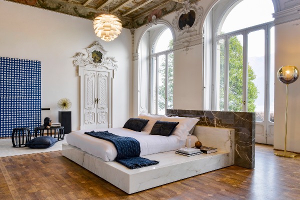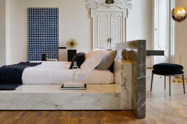 Дизајниран од Еугенио Биселија, со главна цел да стане централна точка на просторот за спиење, овој кревет повеќе личи на скулптура отколку на парче мебел и содржи ексклузивни, елегантни елементи од природен камен.