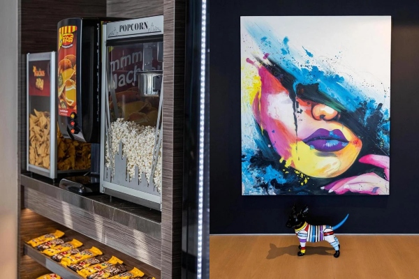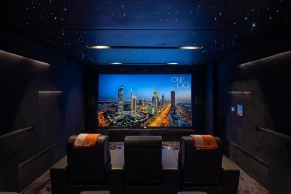 Покрај приватното кино на отворено, има и затворен простор, на кој му беа дадени IMAX екран, 4k проектор и звучен систем „Долби Атмос“. Секако, искуството со гледање филмови не би било целосно без свежи пуканки, а оваа вила има сопствен апарат.
