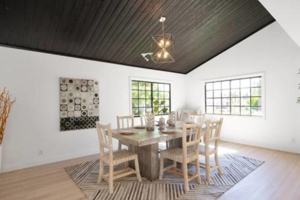 Влезната врата се отвора во огромна комбинирана дневна / трпезарија со широки штици од дрво од дрво, чисти бели wallsидови и вдлабнато LED осветлување. Трпезаријата има засводена дрвена таванот насликана во длабок јаглен.