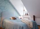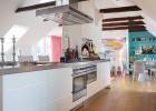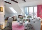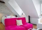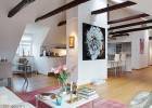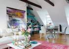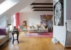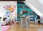 Едноставен, со претежно бел мебел, дрвени потпорни греди и ѕидови од цигли… совршена околина за создавање на живописен ентериер кој сопствениците го оживеале со мноштво бои, односно со розови, сини и портокалови тонови. Трособниот стан во поткровјето изобилува со шарм и е сјајна инспирација за уредување на домот.