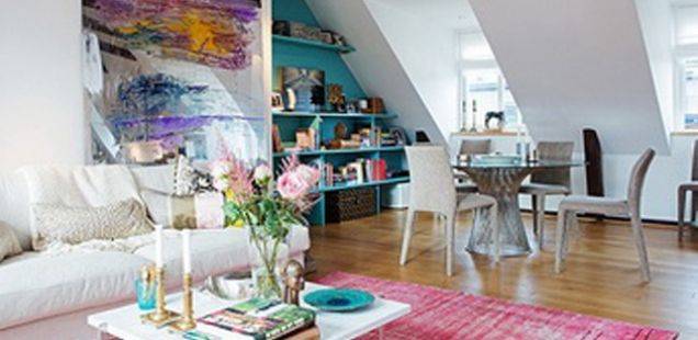 Едноставен, со претежно бел мебел, дрвени потпорни греди и ѕидови од цигли… совршена околина за создавање на живописен ентериер кој сопствениците го оживеале со мноштво бои, односно со розови, сини и портокалови тонови. Трособниот стан во поткровјето изобилува со шарм и е сјајна инспирација за уредување на домот.