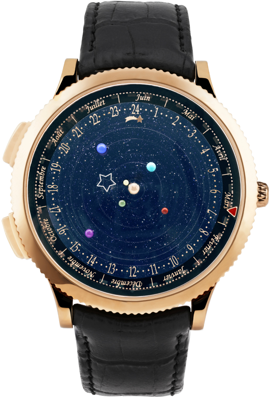 Компанијата за накит Van Cleef & Arpels им покажа на другите производители на часовници како се работи. Нивното издание Van Cleef & Arpels Midnight Planetarium Poetic Complication е најубавиот и исклучителен часовник на нашата листа. Ова хоролошко ремек дело го прикажува времето со помош на ѕвезда што паѓа која ротира по рабовите на бројчаникот, но начинот на кој овој часовник инкорпорираше значителни вселенски тела од нашиот сончев систем е уште поимпресивен. Сонцето и шесте планети што можете да ги видите со голо око се претставени со разни скапоцени камења и ротираат во реално време.