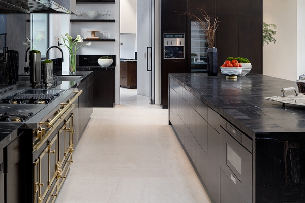 Отворената кујна е дефинирана со елегантни црни ормани и уредите / апаратите La Cornue, со централен остров создаден од вековно скаменето дрво. Ако мислите дека оваа кујна е едноставно премногу убава за употреба, знајте дека во близина на неа има уште една, така да се каже, комерцијална.
